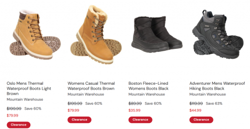 The Black Friday Preview Sale is on now at Mountain Warehouse Canada, where you can save 50% off or more on select lines. Jackets and skiwear are 50% off or more, and flannel and fleece and footwear are 60% off or more. Free tracked shipping is offered on orders of $120 or more, and here are some of the styles of footwear that are 60% off or more: