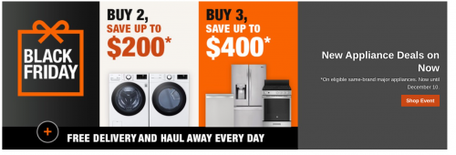 Until December the 10th you can save up to $400 on appliances at Home Depot Canada. Buy two and save up to $200, or buy three and save up to $400. You will also get free delivery and haul away on your purchase. There are other Black Friday deals available in-store and online until December the 10th, and here are some of the savings: