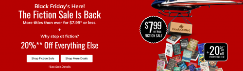 Black Friday has begun at Book Outlet Canada, and The Fiction Sale is back. Shop select titles for $7.99 or less, and get 20% off everything else. Black Friday promotions are valid until December the 2nd, and shipping is free on orders of $50 or more. You can also shop big savings in the Discount Aisle, and here are some of the markdowns on bestsellers: