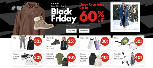 The Black Friday Sale is on now at Sport Chek Canada, and there are savings that are valid until December the 3rd. There are door crashers up to 60% off, and other deals include 30% off, Nike, 25% of The North Face, 30% off Hydroflask, Prince, and women's and men's shoes, and 40% off Woods clothing and outerwear, Ripzone clothing, outerwear, and shoes, and PowerBilt golf sets, bags, and carts. You can also get 50x the bonus CT money on all Yeti products until December the 3rd. Here are some of the deals on men's clothing and shoes: