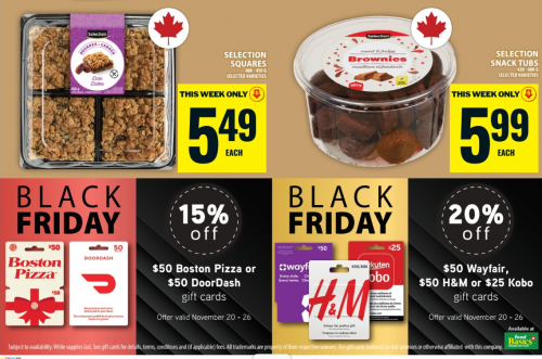 This week Food Basics Ontario has a gift card offer for Black Friday. From November the 20th to the 26, get 15% off $50 Boston Pizza or $50 DoorDash gift cards. $50 Wayfair, $50 H&M, and $25 Kobo gift cards are also on sale, and these are 20% off. If you are visiting Food Basics this week, here are some of the other deals that you will find in store: