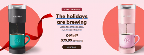 The holidays are brewing at Keurig Canada, and you can currently get the K-Mini for just $79.99, a savings of $30 off the regular price of $109.99. You can also save up to 50% on select coffee makers, and you can save on accessories as well. Shipping is free on orders of $59 or more, and here are some of the deals that are available: