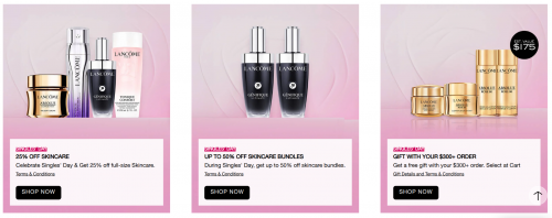 Lancome Canada has a Singles Day Sale on now, and you can save up to 50% off on all skin care. Until November the 14th if you sign up at Lancome you will also receive a free Hypose mascara with the purchase of $100 or more. Until November the 12th, with your purchase of $300 or more you will receive a free gift valued at $175. If you spend $500 or more will receive a free gift valued at $195. Shipping is free on orders or $50 or more if you are a amember, and here are some of the Singles Day skin care bundles that are up to 50% off: